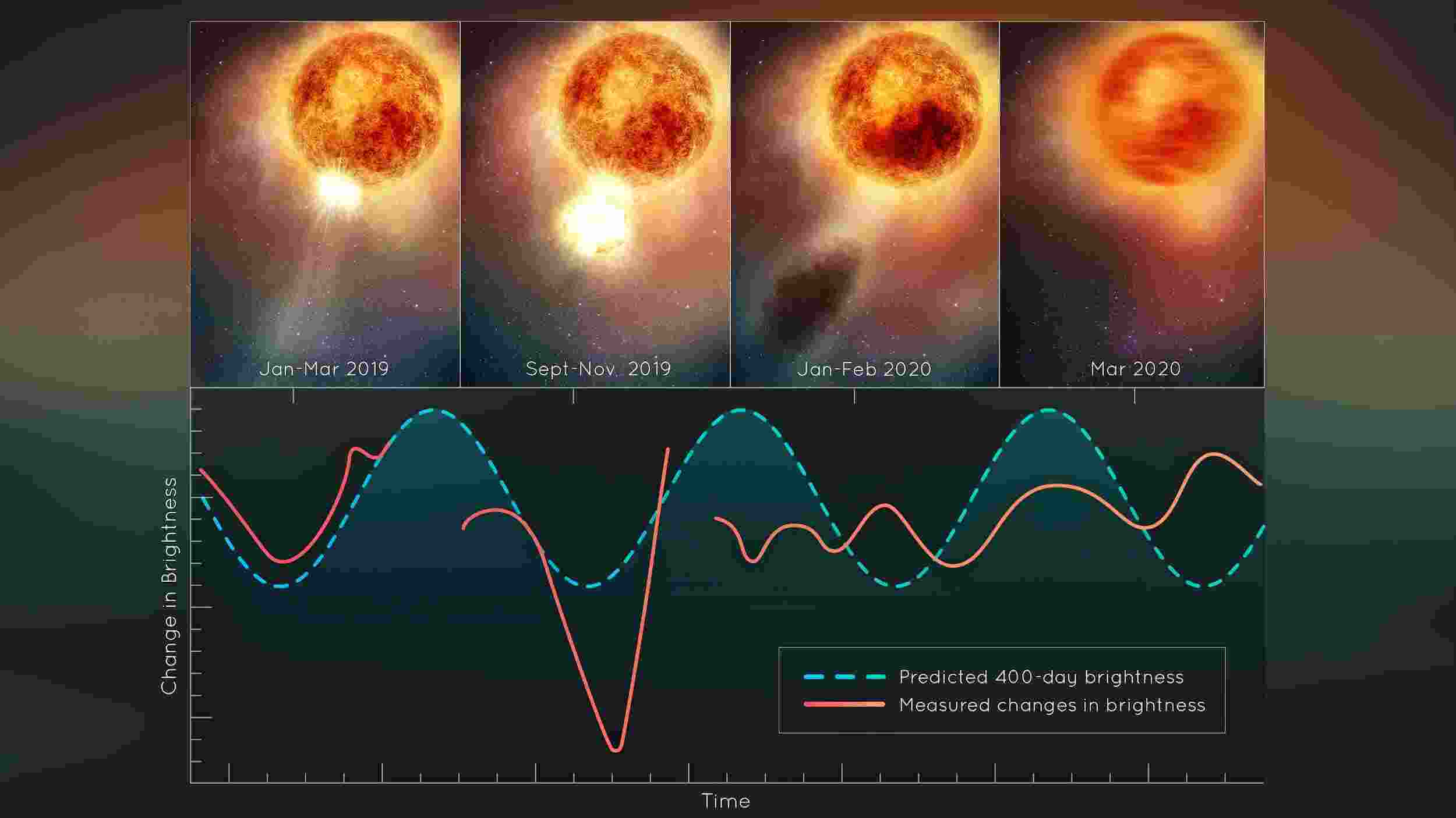 নক্ষত্রটি এখনও ধীরে ধীরে সুস্থ হয়ে উঠছে। ফটোস্ফিয়ার নিজেকে পুনঃনির্মাণ করছে। অভ্যন্তরটি একটি ঘণ্টার মতো প্রতিধ্বনিত হচ্ছে, মনে হয় যেন একটি স্লেজহ্যামার দিয়ে আঘাত করা হয়েছে যা নক্ষত্রের স্বাভাবিক চক্রকে ব্যাহত করছে। এর মানে এই নয় যে দানব নক্ষত্রটি শীঘ্রই যে কোনও সময় বিস্ফোরিত হতে চলেছে। তবে নক্ষত্রটির জীবনের শেষ অধ্যায়গুলি জ্যোতির্বিজ্ঞানীদের বিস্মিত করবে।