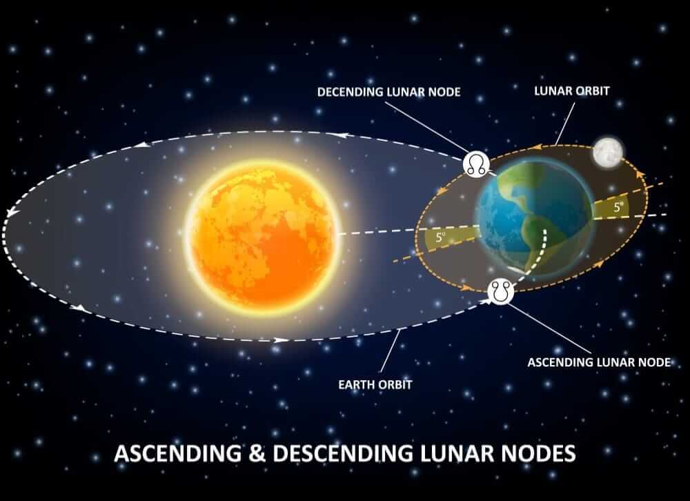 - একটিকে বলা হয় উর্ধ্বগামী নোড (Ascending Node)। এখানে চাঁদ পৃথিবীর কক্ষপথের সমতলের নিচ দিক থেকে উপরের দিকে উঠে আসে।
