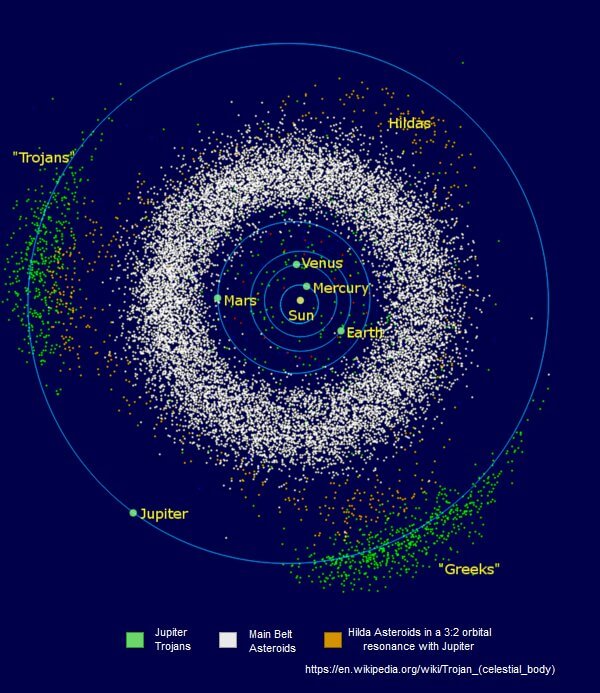 এই দুটি বিন্দুতে যে গ্রহাণুরা আছে, তারা বৃহস্পতির সাথে একই কক্ষপথে সামনে ও পিছন থেকে একই সময় সূর্যকে প্রদক্ষিণ করে চলছে, এদের কে বলে ট্রোজান গ্রহাণু।
