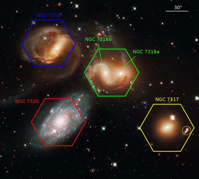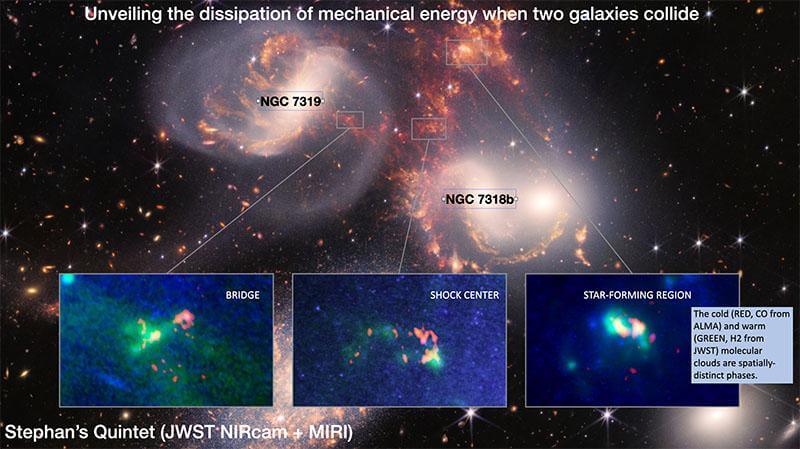 গ্যালাক্সি NGC 7319 এবং NGC 7318b একত্রিত হওয়ার প্রক্রিয়ায় রয়েছে, যা ইন্টারগ্যালাকটিক মাধ্যমে একটি ধাক্কা সৃষ্টি করছে। আমরা এই দুটি ছায়াপথের মধ্যে লাল রঙে, H2 ডাইহাইড্রোজেন অণুর নির্গমন দেখতে পাই। নীচে ছয়টি অঞ্চলের মধ্যে তিনটি দেখায় যেগুলি এই গ্যাসের গতিশীলতা এবং তাপমাত্রা পরিমাপ করার জন্য JWST-এর MIRI যন্ত্রের সাথে পর্যবেক্ষণ করা হবে।